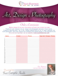 3. And Sign-up sheets for the practitioner’s individual sessions for the event. Each Sign-up sheet was customized for each practitioner and their designated session setup. I included a short description of the session, and bio- photo for each expert. I created an art order form for myself (because I had been given the opportunity to sell my art during the event).