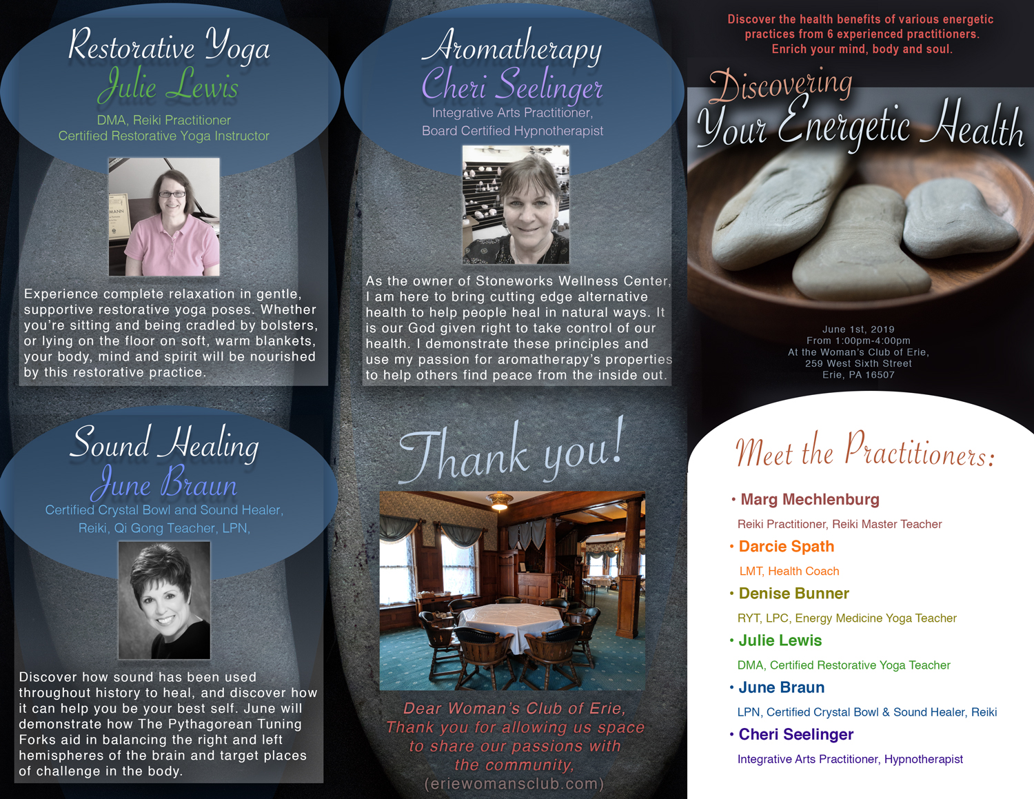 For the Discovering Your Energetic Health Event, I worked with 6 practitioners, looking to hold a new event at the Woman’s Club of Erie on June 1st 2019. The event brought together practitioners who specialized in integrative modalities including sound healing, energy testing and assessments, restorative yoga, energy medicine yoga, healing art, nutrition and health, and essential oils & aromatherapy.